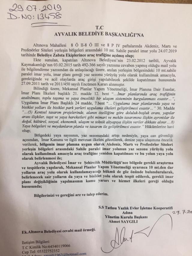 Sitemizin sahile bakan bölümünde bulunan 10 mt. sahile paralel imar yolu 24.07.2019 tarihinde Ayvalık Belediyesi personeli tarafından aksi yönde encümen kararı olmasına rağmen trafiğe açılmıştır. Söz konusu duruma itiraz etmek üzere Yönetim Kurulu Başkanı Ahmet Saygılı tarafından Ayvalık Belediyesi’ne verilen dilekçe aşağıdadır. Tüm üyelerimize önemle duyurulur.